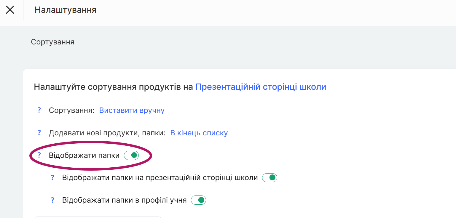 Нижче представлено перелік папок, де ви можете змінювати індивідуальні налаштування для кожної з них. Якщо ви ввімкнули відображення папок на презентаційній сторінці школи, у вас буде можливість приховати будь-яку з них. Залежно від вибраних параметрів змінюватиметься іконка — вона допоможе швидко зорієнтуватися, а підказка при наведенні покаже, які папки видно учням, а які приховано.