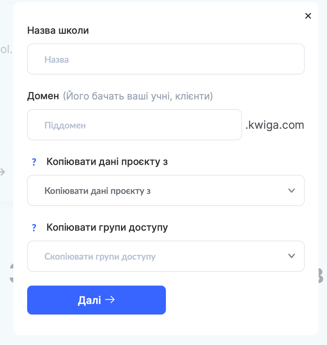 Домен — піддомен у форматі назва.kwiga.com (його бачать ваші учні та клієнти). Рекомендуємо продумати піддомен заздалегідь. Якщо змінити його пізніше, попереднє посилання перестане діяти. Краще зробити це одразу або принаймні до того, як додасте учнів.