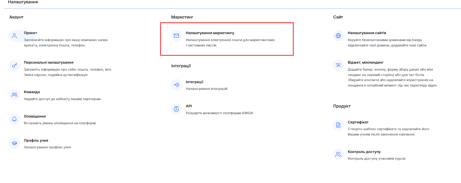 Для того, щоб замінити стандартне зображення, відкрийте у верхньому меню Налаштування - Налаштування маркетингу.