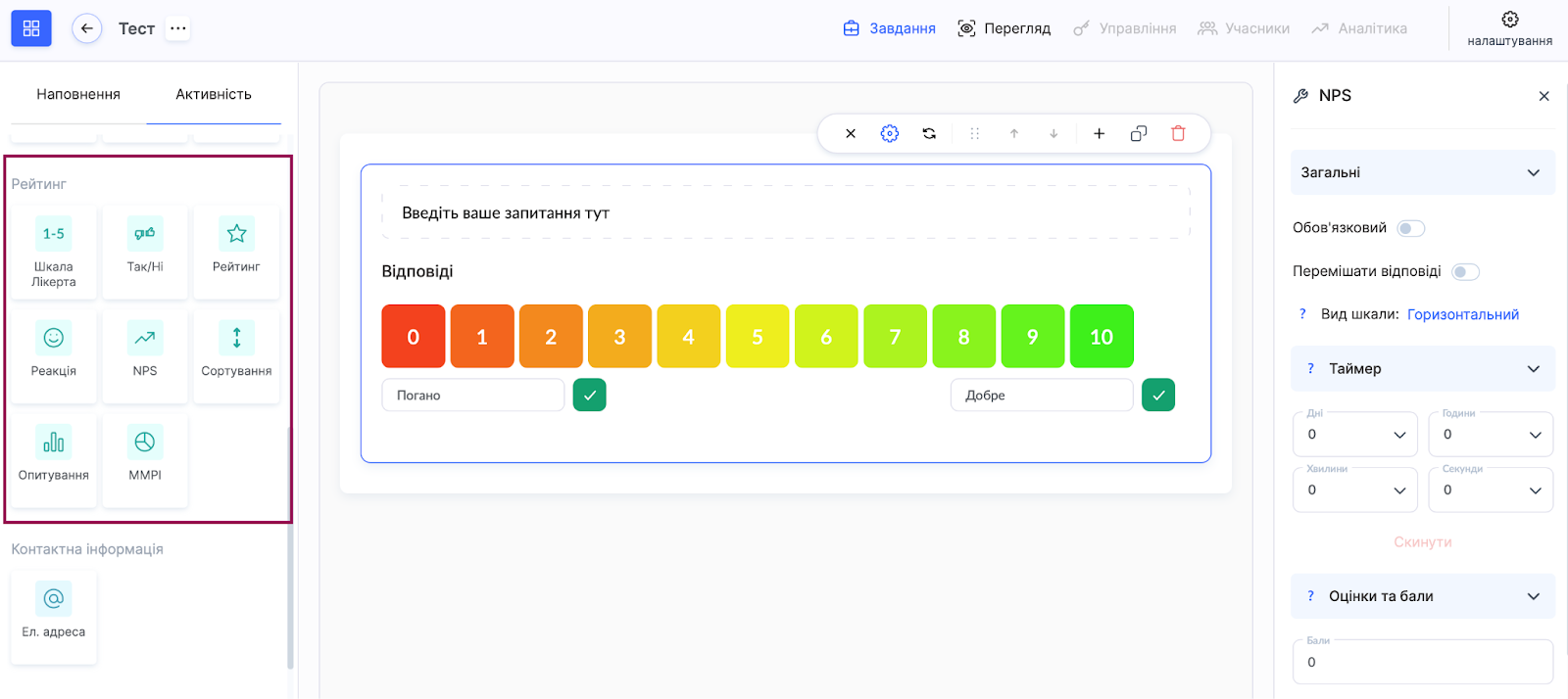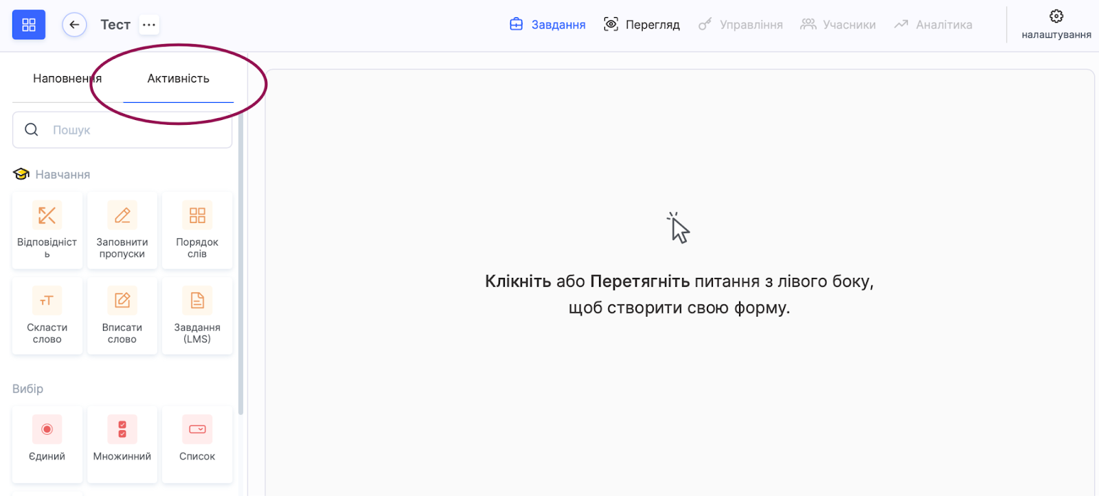 На лівій панелі представлені всі доступні типи питань, організовані в категорії для зручності пошуку та використання.