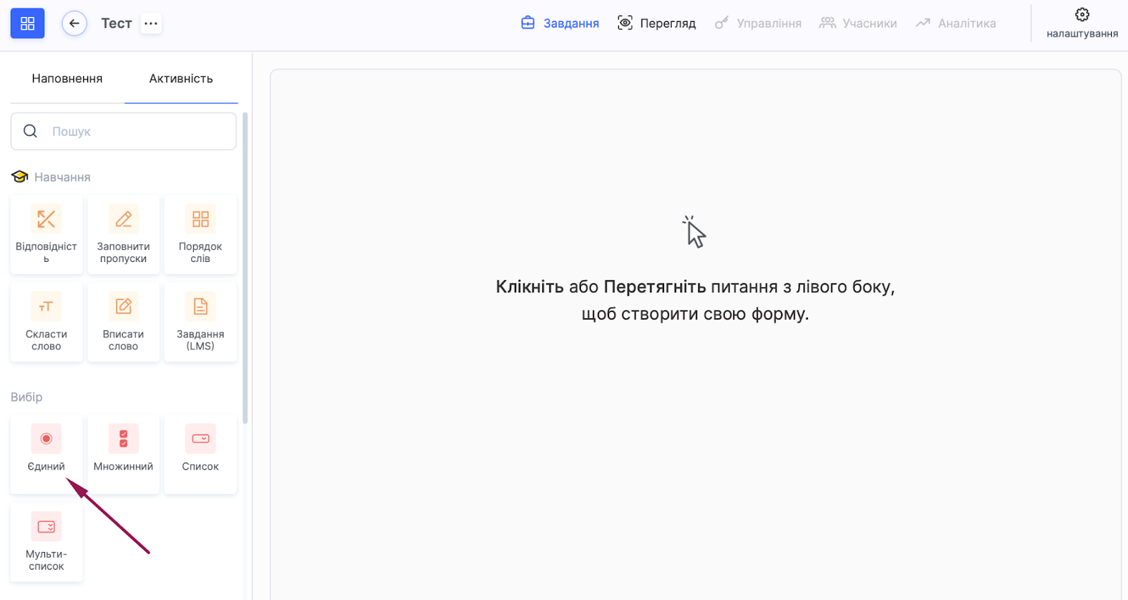 Учень може обрати одну правильну відповідь серед запропонованих варіантів. Додатково можна увімкнути функцію, що дозволяє учню вписати свій варіант відповіді.