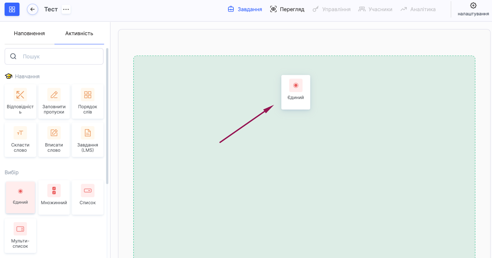 Клікніть на обраний тип або перетягніть його в центральну частину екрана