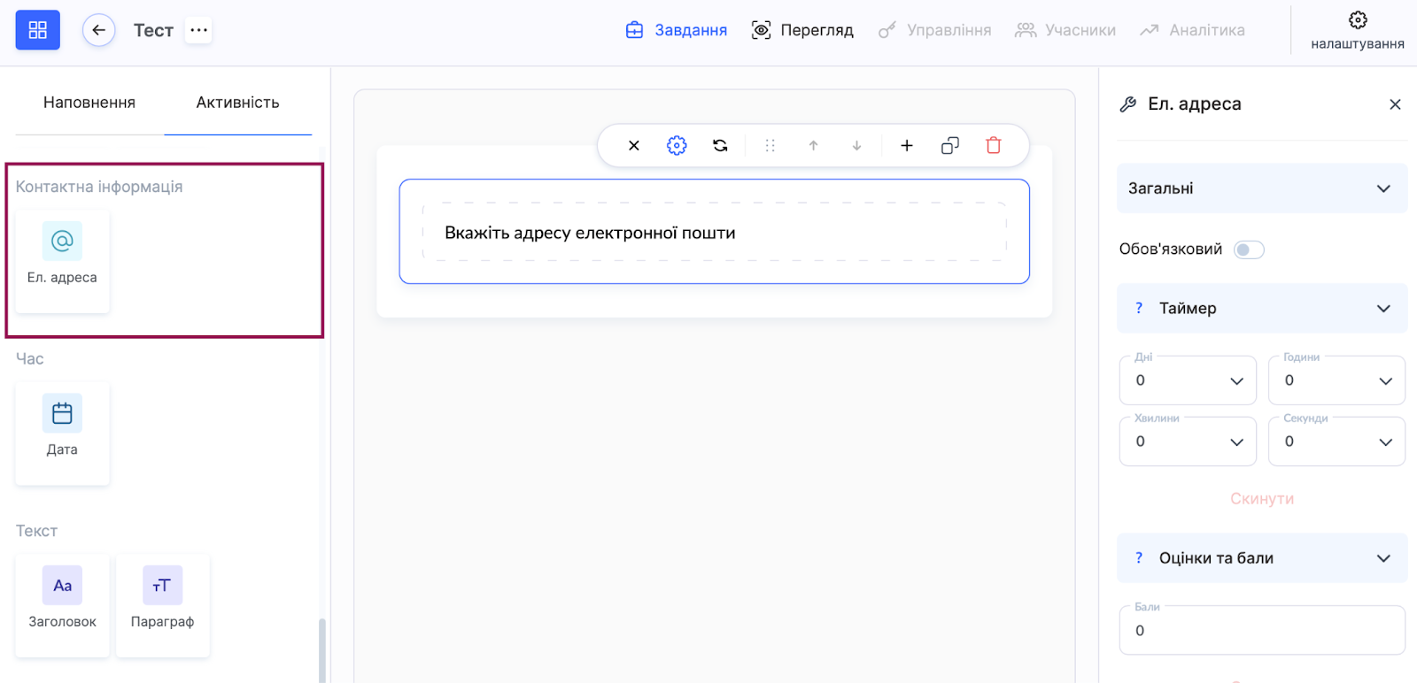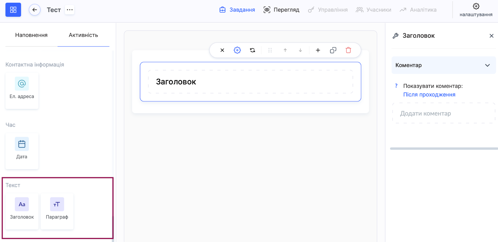 Текстовий елемент для структурування форми, додавання заголовку, який не є окремим типом квіза.