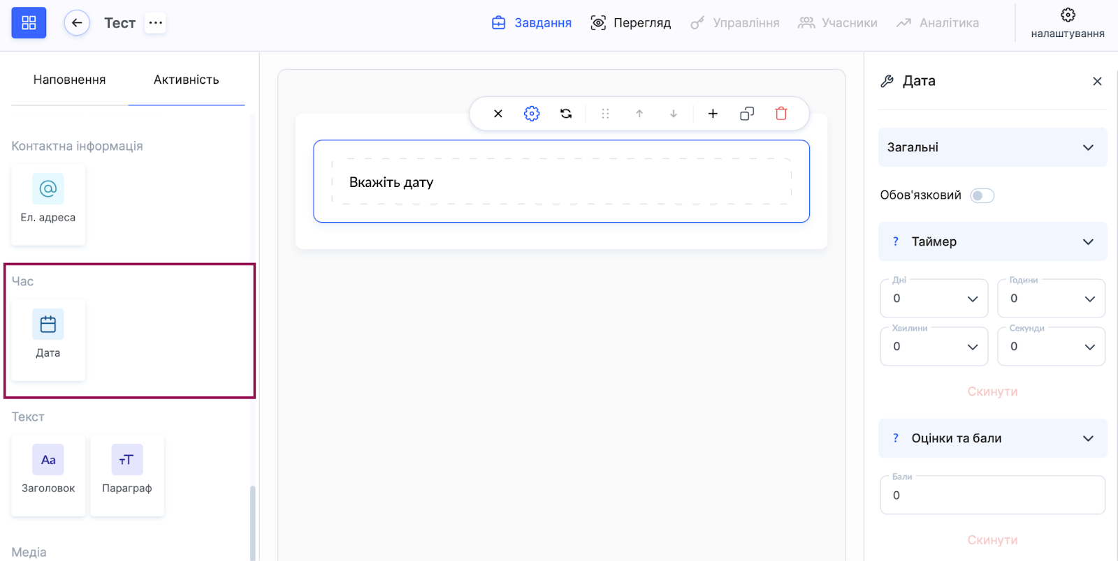 Можливість додавати зображення та відео безпосередньо в квіз. Використовуйте для ілюстрації питань, створення візуальних завдань або додавання навчальних матеріалів.