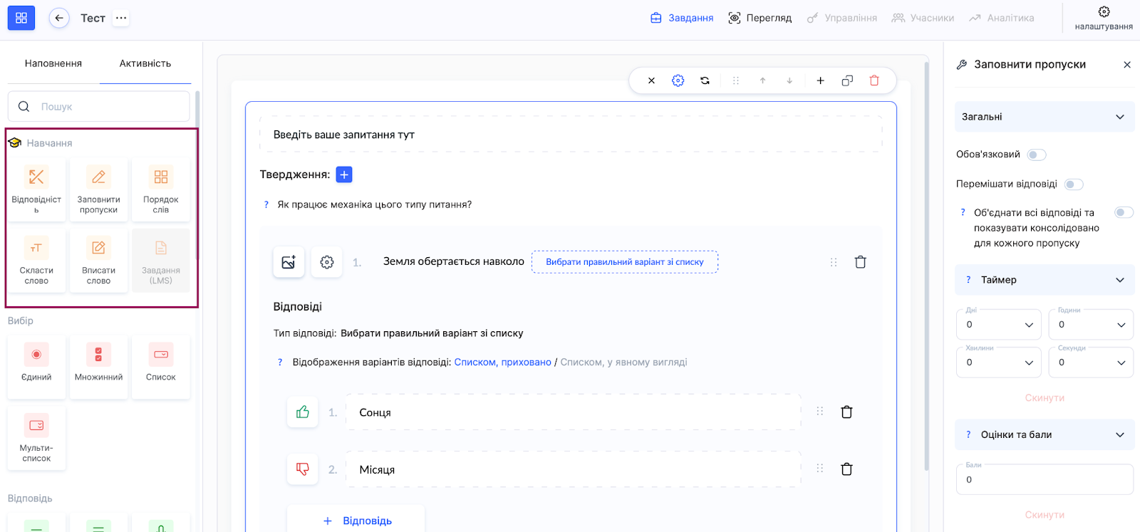 Завдання, де потрібно вставити пропущені слова чи значення в текст. Можна також додавати зайві варіанти відповідей, щоб ускладнити завдання.