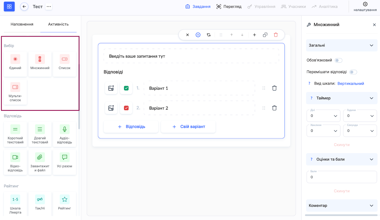 Наповніть та налаштуйте обрану активність, наприклад додайте питання та варіанти відповідей.