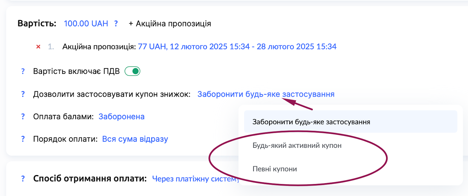 Важливо: купон також можна закріпити за пропозиціями як при їх створенні, так і при редагуванні. Також у налаштуваннях самої пропозиції можна вказати, які купони до неї застосовуються. Детальніше про налаштування пропозицій в окремій статті.
