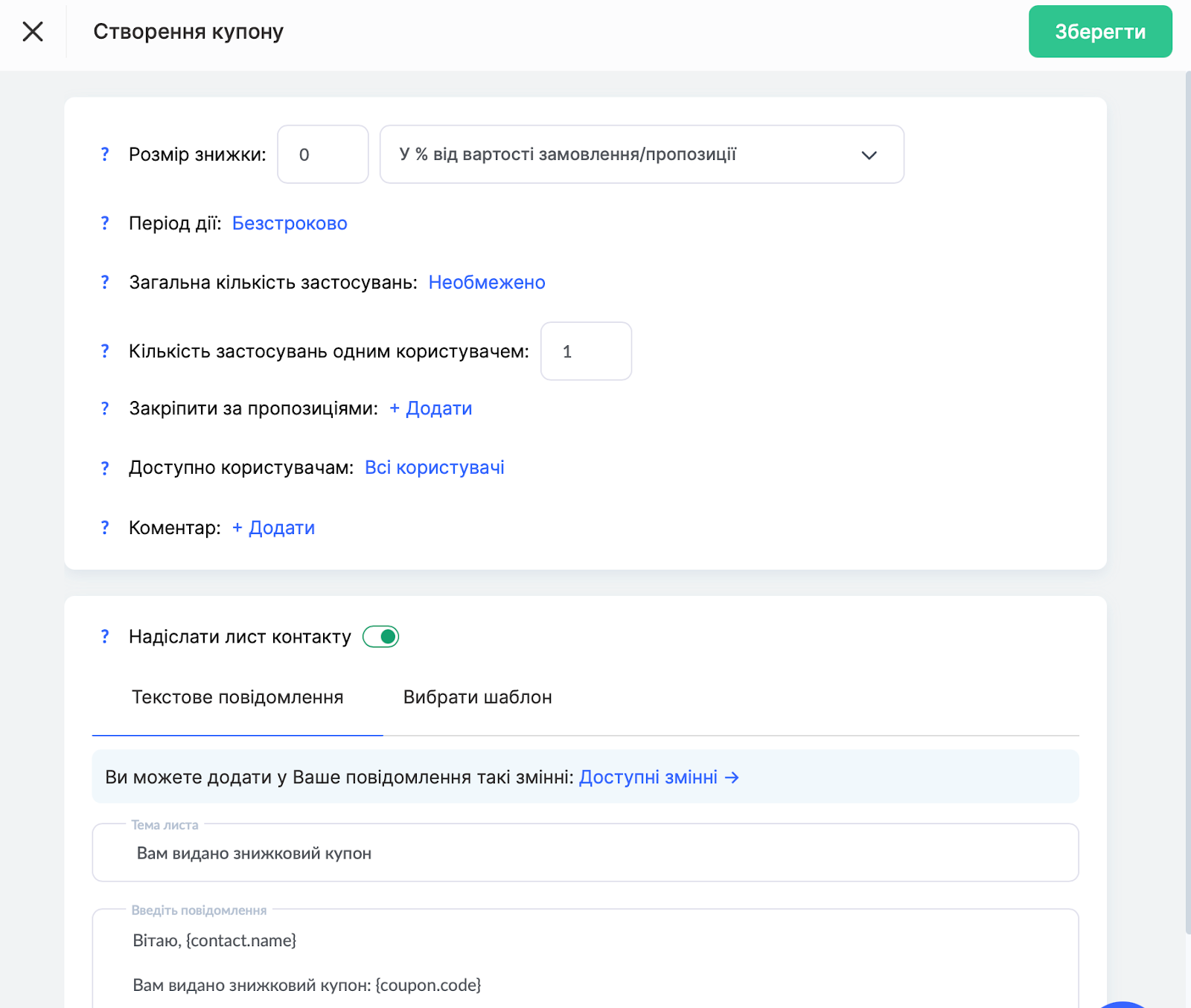 Список контактів – визначає, чи є у купона обмеження за групами користувачів. Якщо обмежень немає, купон доступний усім клієнтам.