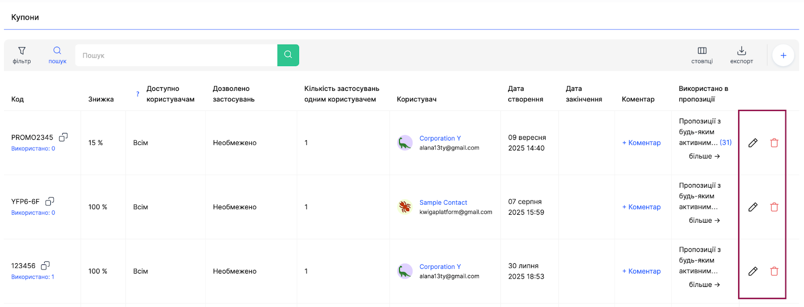 У списку купонів ви можете редагувати або видаляти купони за допомогою відповідних кнопок. Це дозволяє швидко вносити зміни або видаляти непотрібні коди.