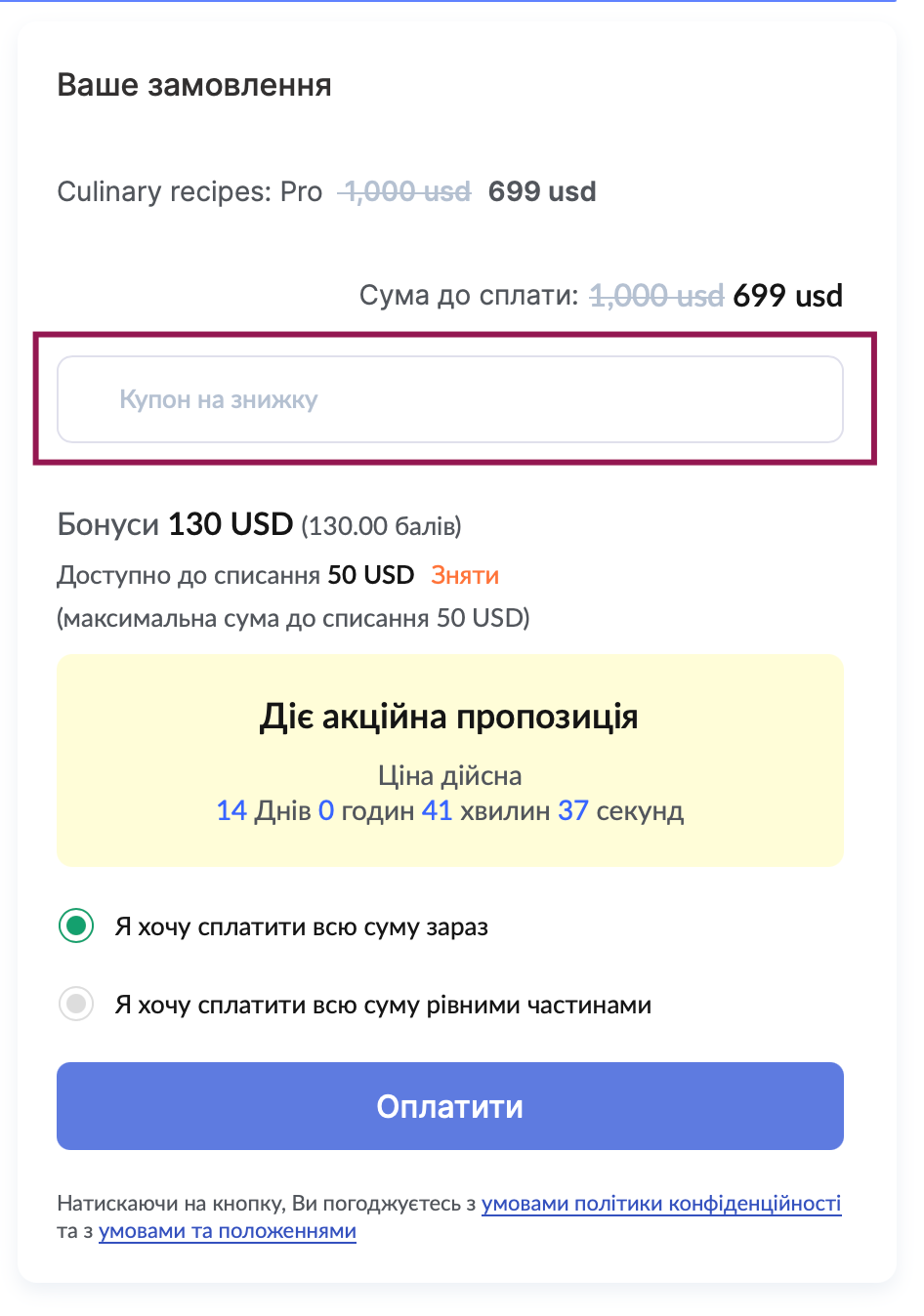 Якщо ви створили купони на знижку та дозволили їх використання для цієї пропозиції, на сторінці з'явиться спеціальне поле для введення промокоду. Учні зможуть застосувати свій купон перед оплатою та одразу побачать оновлену ціну.