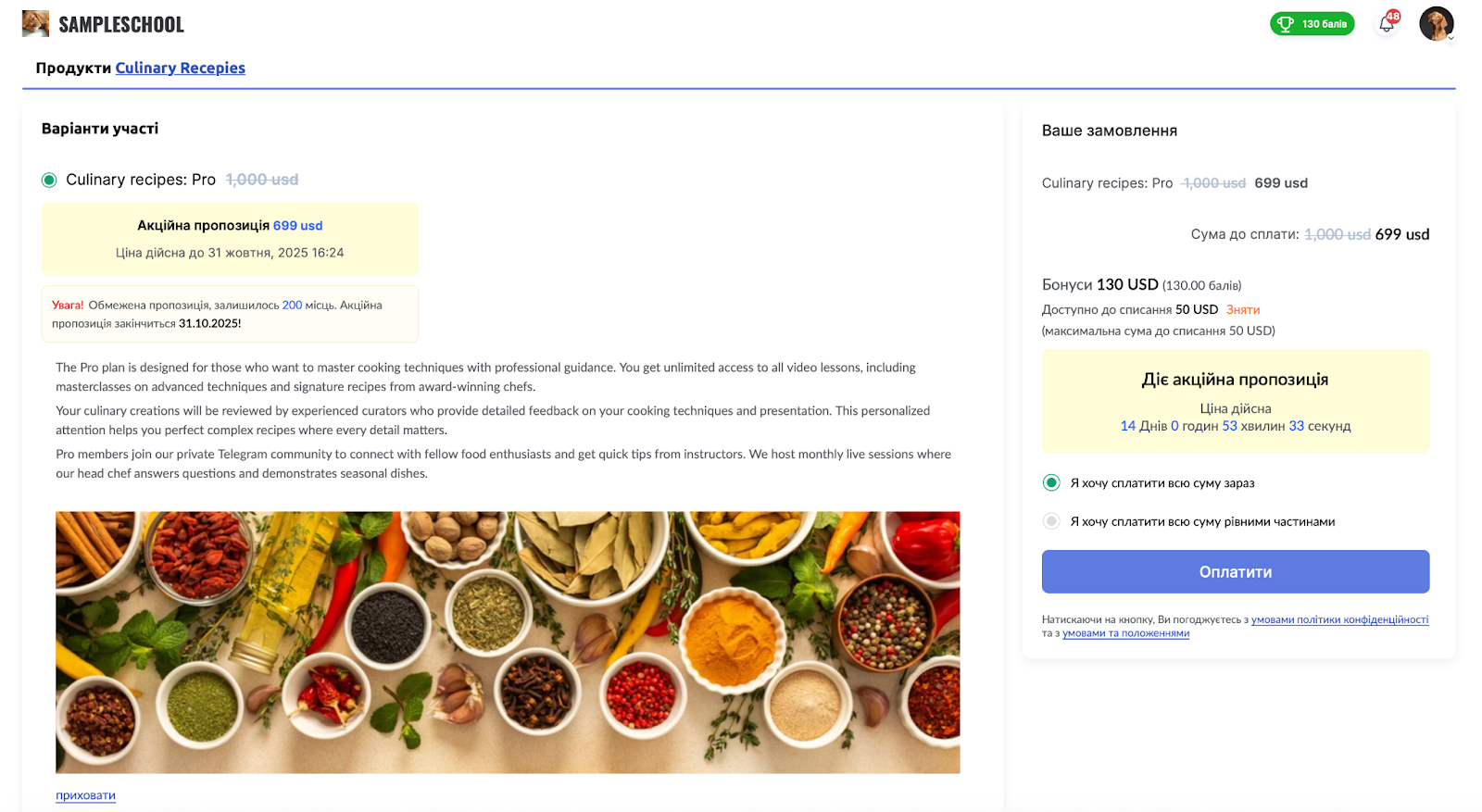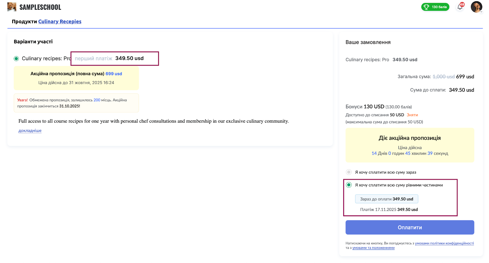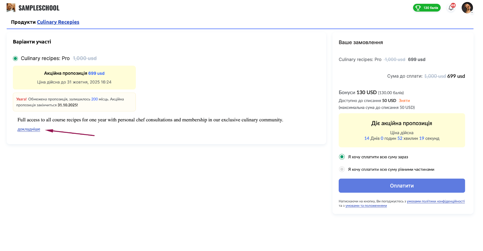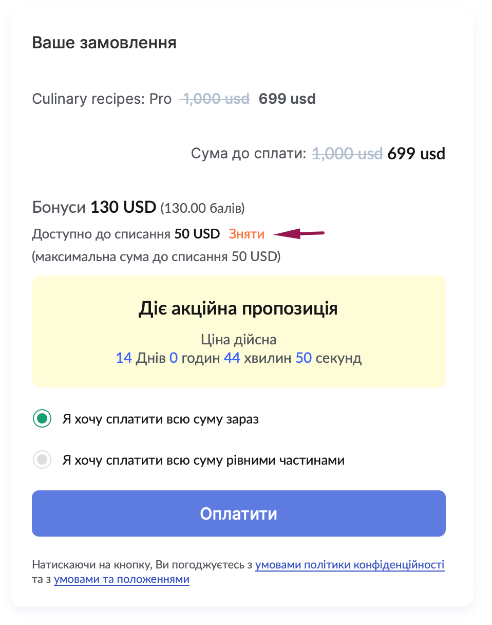 При увімкненій опції оплати балами учні побачать можливість використати накопичені бонуси для зменшення вартості покупки. Система автоматично покаже, скільки балів доступно та яку суму можна списати.