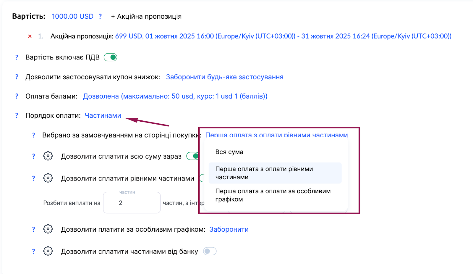На публічній сторінці автоматично відображається інформація про доступні способи оплати. Якщо ви налаштували оплату частинами, учні побачать можливість розбити платіж на кілька внесків. При налаштуванні оплати частинами можна вказати, яку саме ціну першого платежу побачить клієнт на сторінці покупки.