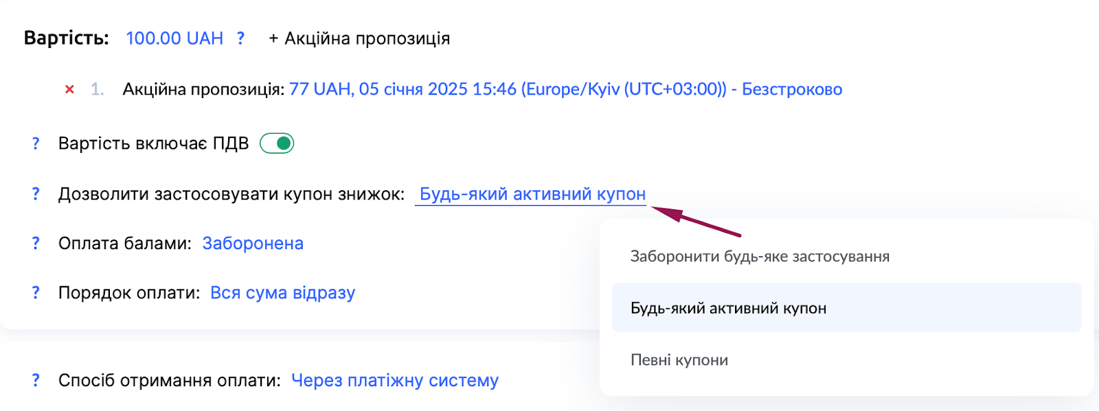 Також ви можете заборонити будь-яке застосування купонів на знижку, дозволити будь-який активний купон або обмежити використання лише певними купонами, які Ви створите спеціально для цієї пропозиції. Детальніше про купони в окремій статті.