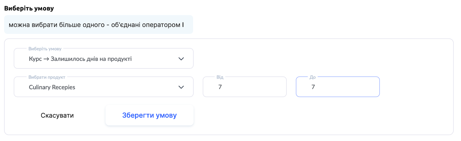 Умова - Залишилось днів на продукти, далі Виберіть назву продукту та вкажіть кількість днів і Збережіть умову.