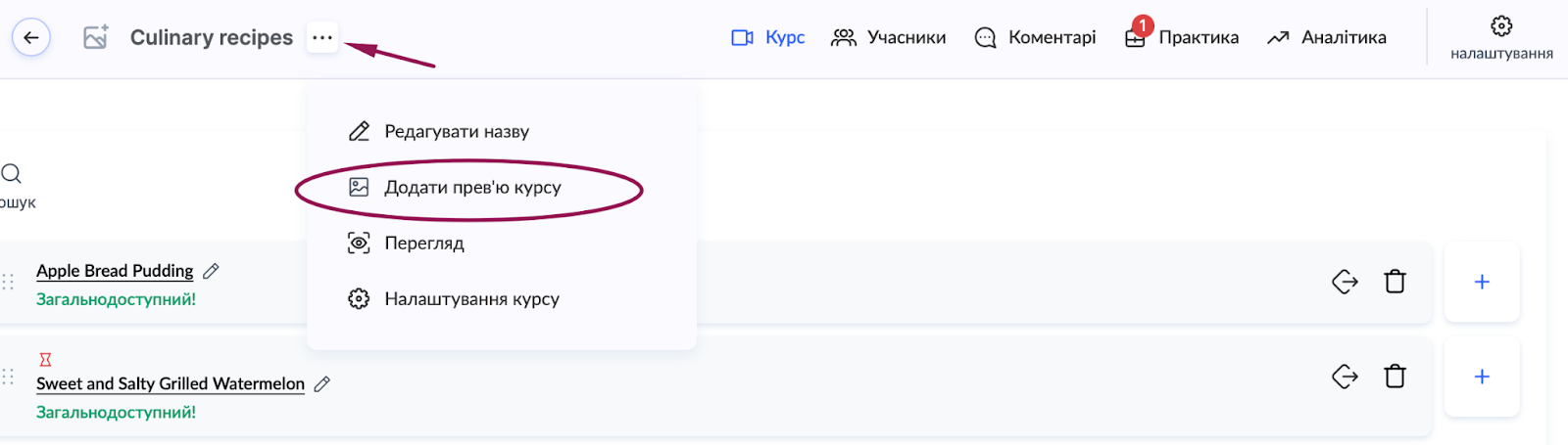 Натисніть на значок із трьома крапками поруч із назвою курсу та виберіть опцію Додати превʼю курсу.