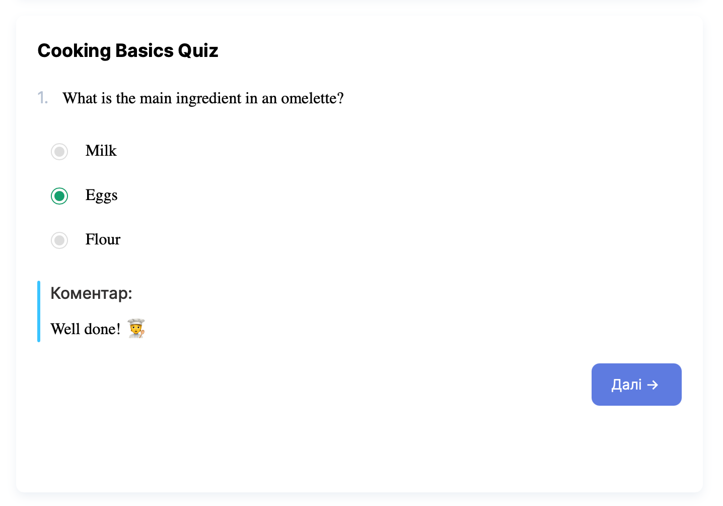 Якщо ви обрали опцію Відразу при відповіді на запитання, коментар з'явиться одразу після того, як учень дасть відповідь на питання. Це дозволяє отримати миттєвий зворотний зв'язок і зрозуміти логіку відповіді ще під час проходження тесту.