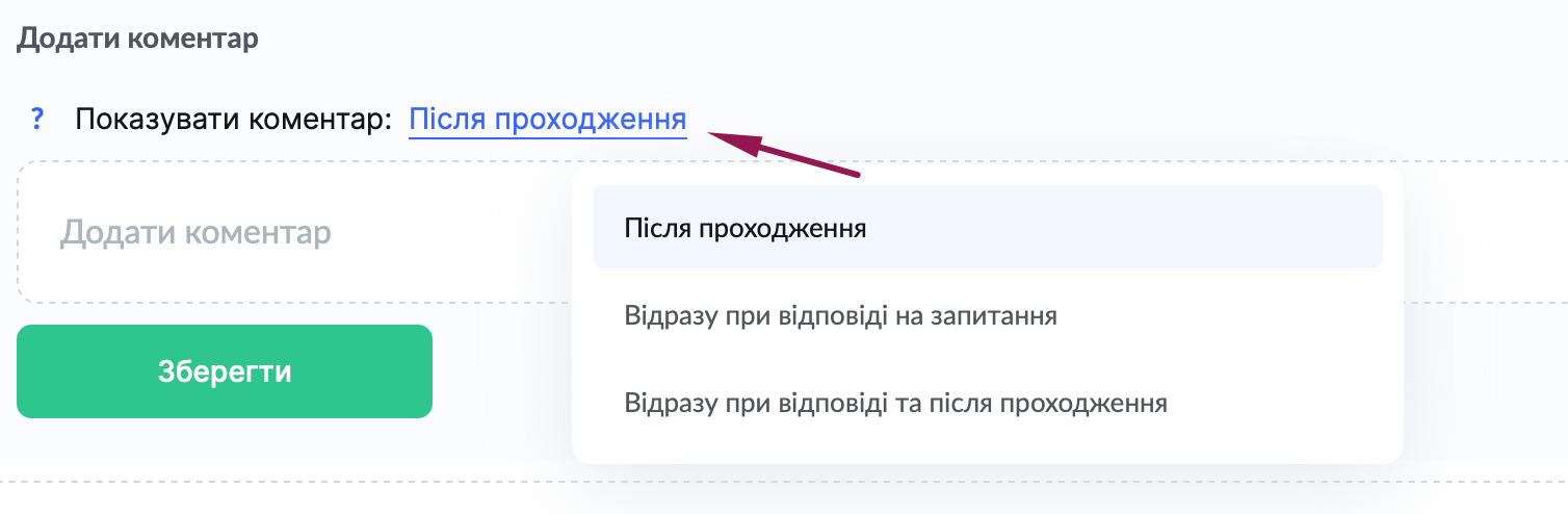 Показувати коментар — оберіть, коли учень побачить коментар: Після проходження (після завершення всього тесту), Відразу при відповіді на запитання, або Відразу при відповіді та після проходження