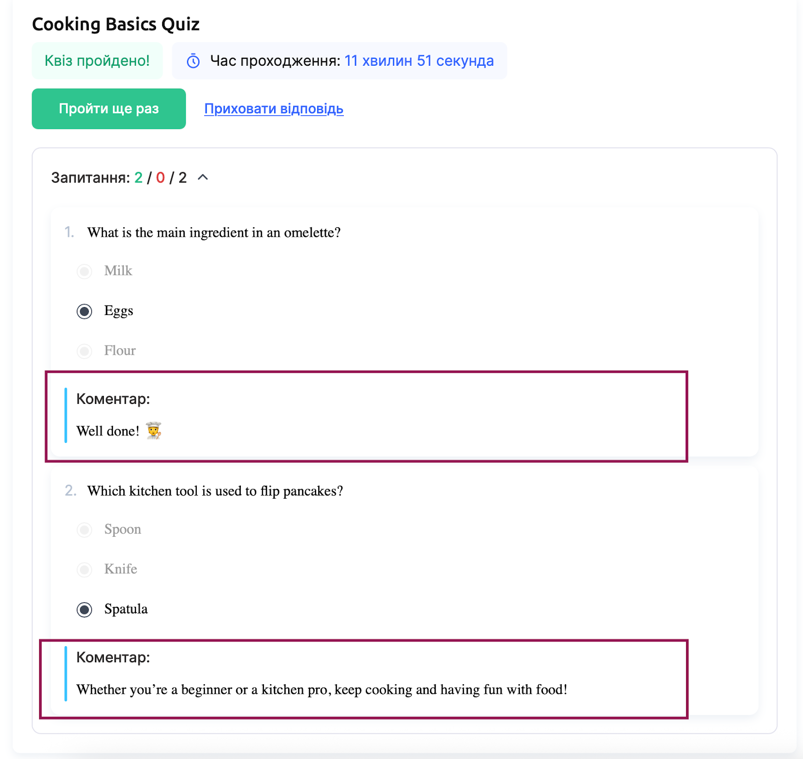 Часто учень проходить тест, бачить оцінку, але не розуміє, де саме він помилився і чому його відповідь неправильна. Коментарі до відповідей допомагають перетворити звичайну перевірку знань на повноцінний навчальний інструмент, який пояснює логіку правильних відповідей і закріплює матеріал.