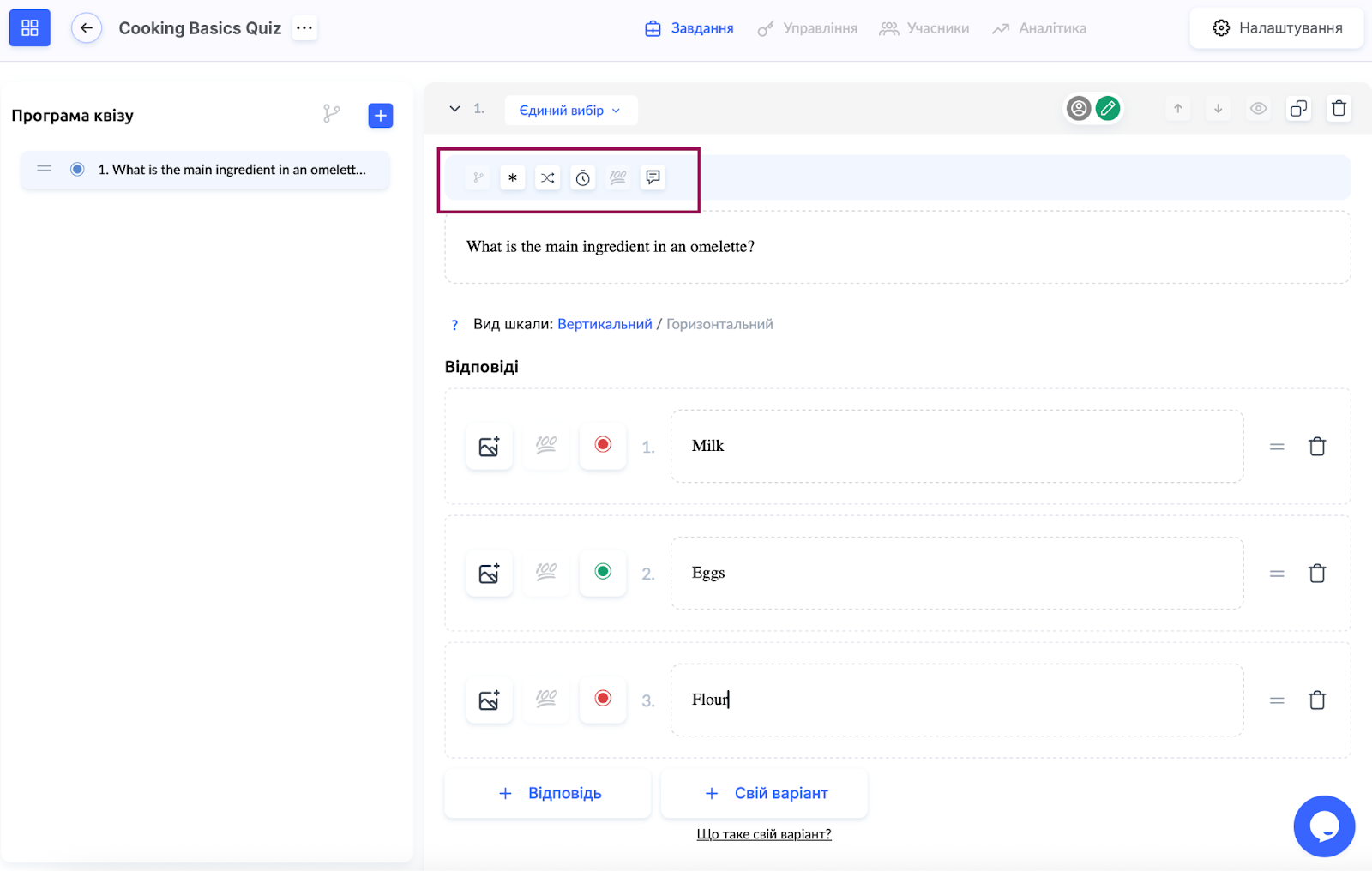 Додайте текст питання та варіанти відповідей через кнопку +Відповідь.